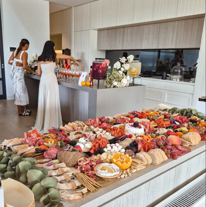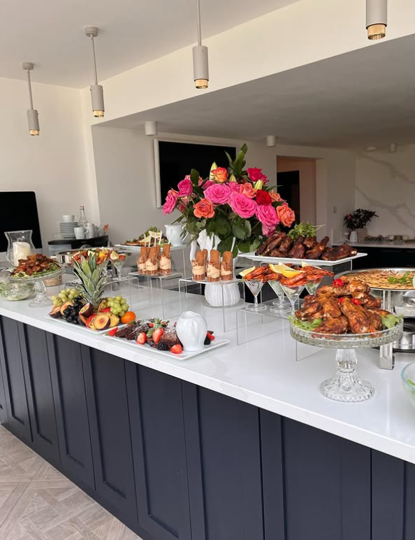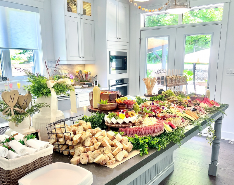 Perfect for a bridal shower, it combines elegance with abundance, making the food display as beautiful as it is delicious.