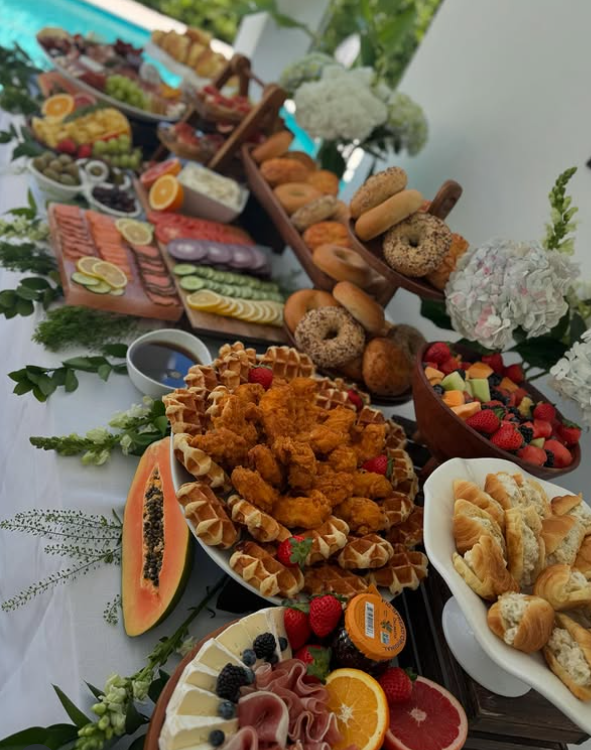 Create a brunch-style bridal shower feast with bagels, fresh fruit, waffles, fried chicken, croissants, and charcuterie.