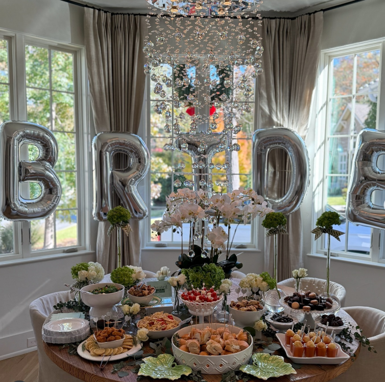 A beautifully styled bridal shower spread featuring mini sandwiches, skewers, pastries, and sweet bites, all set beneath a crystal chandelier and silver “BRIDE” balloons.
