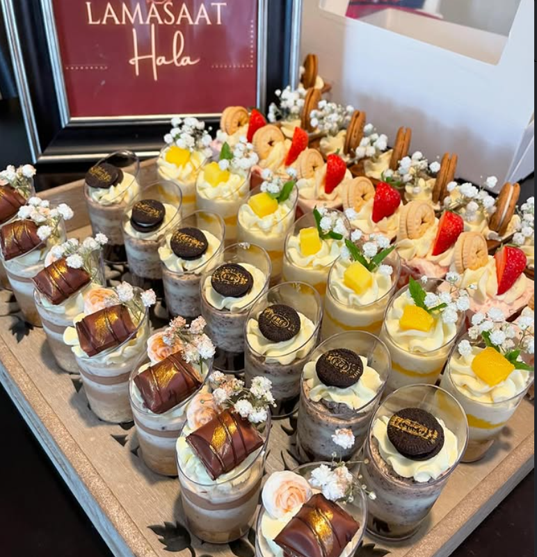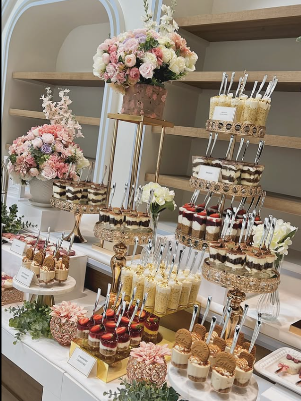 From cupcakes crowned with fresh strawberries to rich brownies, cheesecakes, and layered mousse cups, this setup strikes the perfect balance between elegance and indulgence.