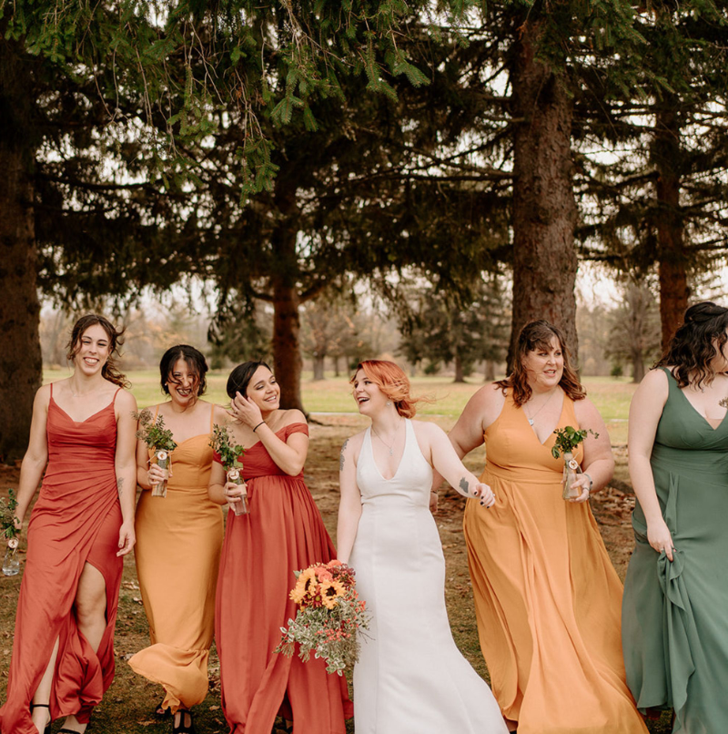 Celebrate the beauty of fall with bridesmaid dresses in rich seasonal shades—burnt orange, mustard, deep red, and forest green.
