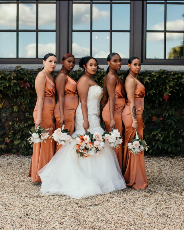 These satin rust-colored bridesmaid dresses add the perfect autumn glow to your wedding palette.