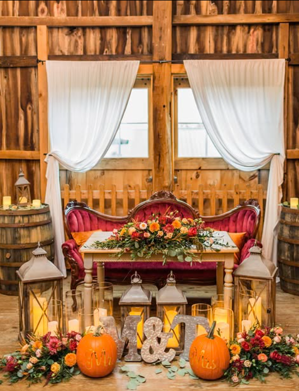 The cozy velvet loveseat, glowing lanterns, and carved pumpkins make it the perfect focal point for a barn wedding.