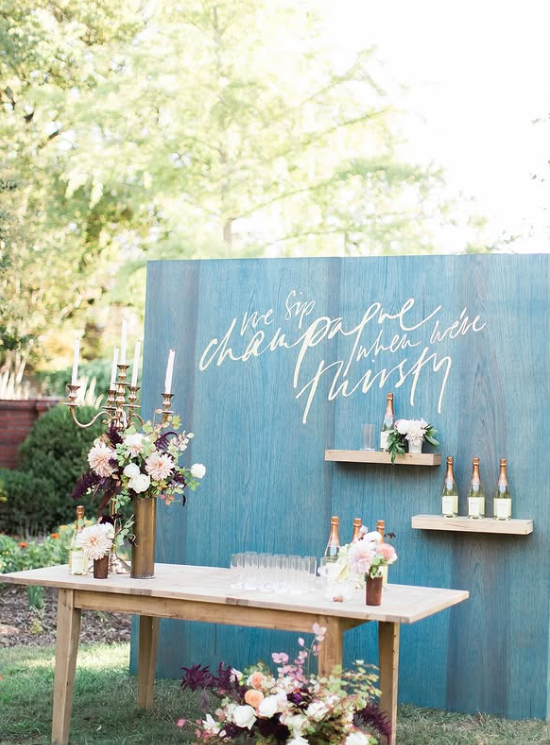Elevate your autumn wedding with a stylish champagne wall and bar setup!