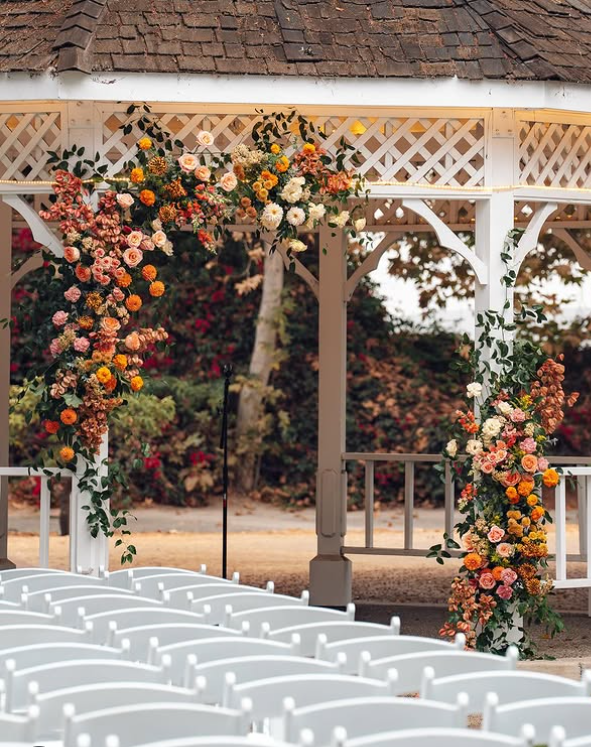 This gazebo is beautifully adorned with rich seasonal blooms in shades of orange, blush, and gold, creating the perfect backdrop for an intimate fall wedding ceremony.