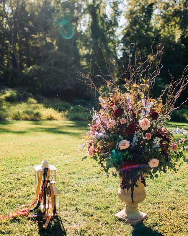 Bring the beauty of autumn into your wedding with lush floral urns overflowing with roses, wild branches, and seasonal greenery.