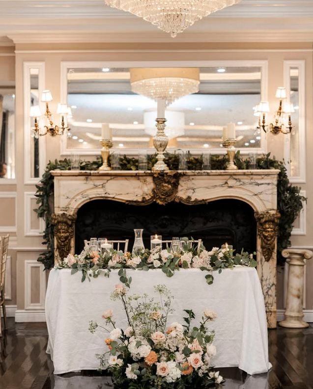 The marble fireplace backdrop, adorned with candles and garlands, adds a timeless romantic touch. Perfect for couples looking to blend classic elegance with cozy autumn vibes for their wedding day.