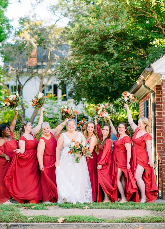 A lively bridal party glowing in rich red bridesmaid dresses, perfectly capturing the warmth of autumn.