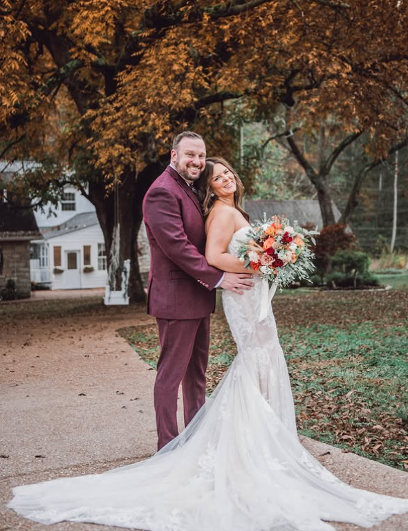The groom’s deep burgundy suit perfectly complements the bride’s elegant lace gown with a long train, while her vibrant seasonal bouquet adds the perfect pop of color.