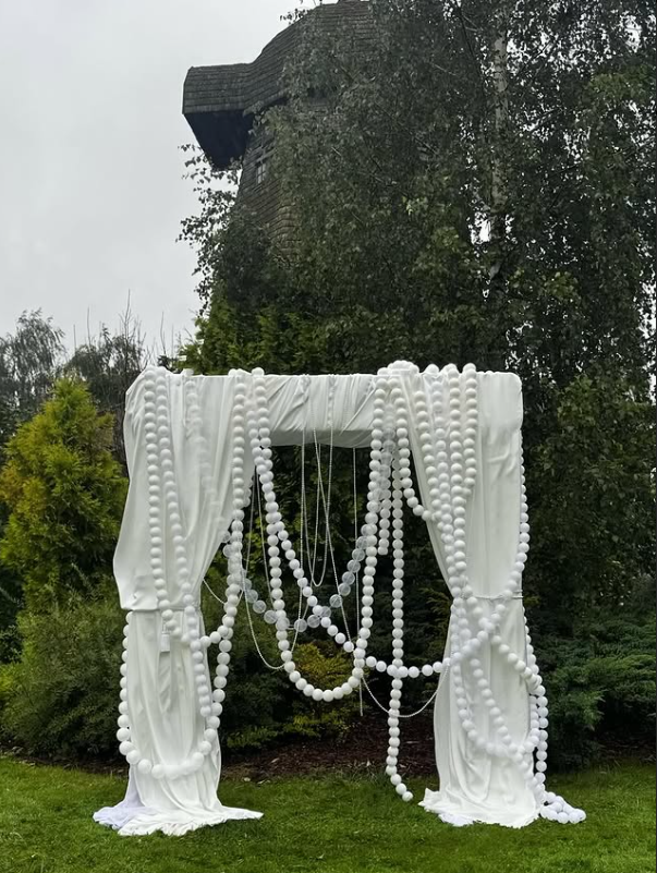 This unique wedding arch combines flowing white drapery with cascading pearl-like garlands, creating a modern and luxurious statement piece.