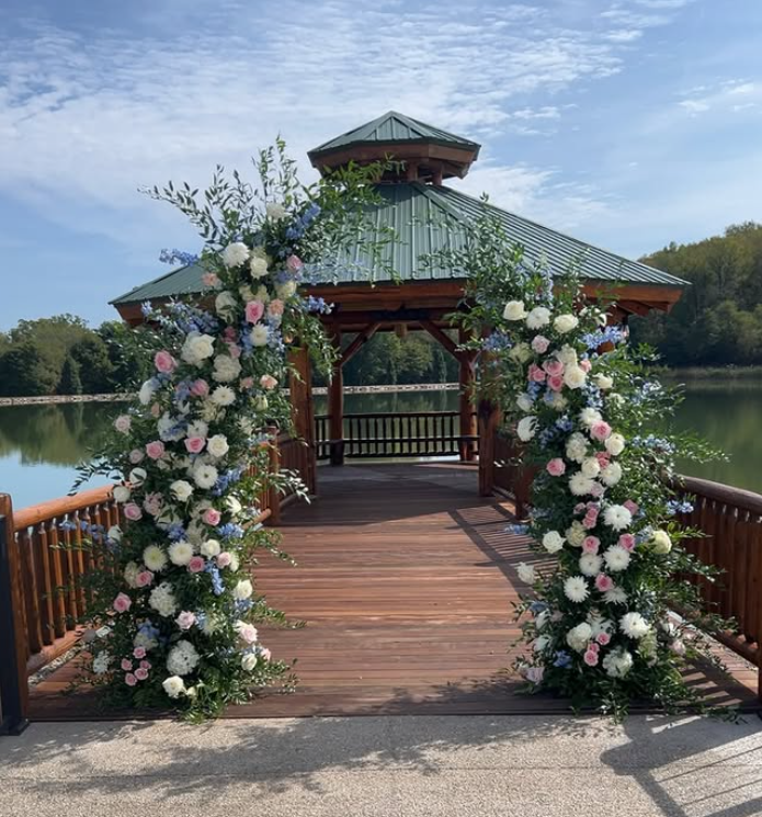 Set against a peaceful lakeside backdrop, this wooden arch bursts with lush greenery and pastel blooms in shades of pink, white, and soft blue.