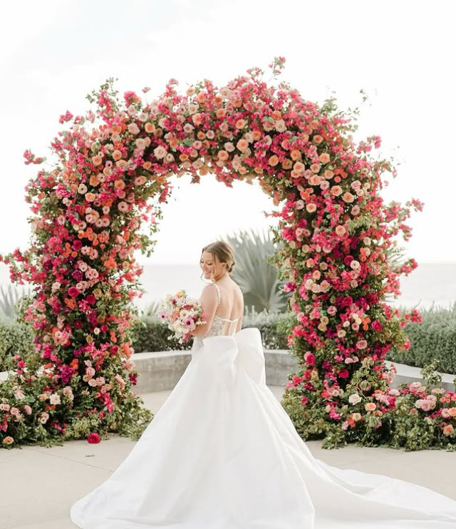 This stunning arch bursts with vivid pink, coral, and peach blooms, creating a bold and romantic statement perfect for a dreamy outdoor ceremony.
