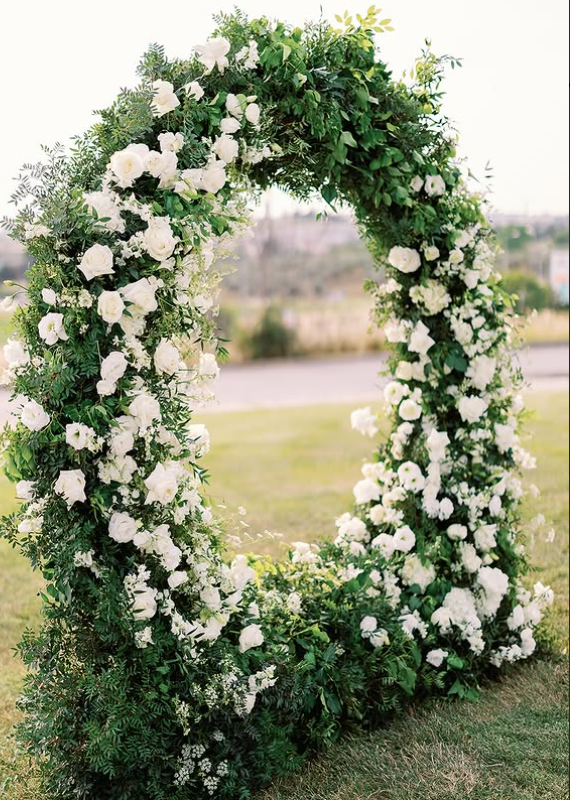The rounded arch design, paired with fresh greenery, makes it perfect for framing your vows, enhancing your photos, or welcoming guests in style.
