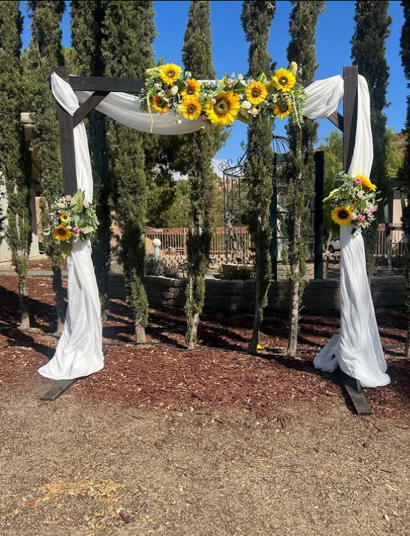 Rustic Sunflower Wedding Arch with Draped White Fabric