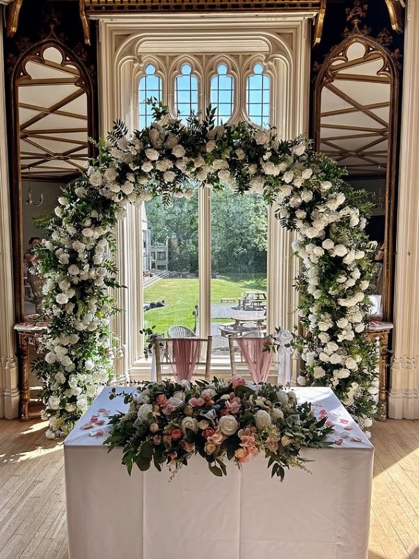 The addition of soft pink accents on the signing table adds a romantic touch, making this arch ideal for a classic, sophisticated wedding.