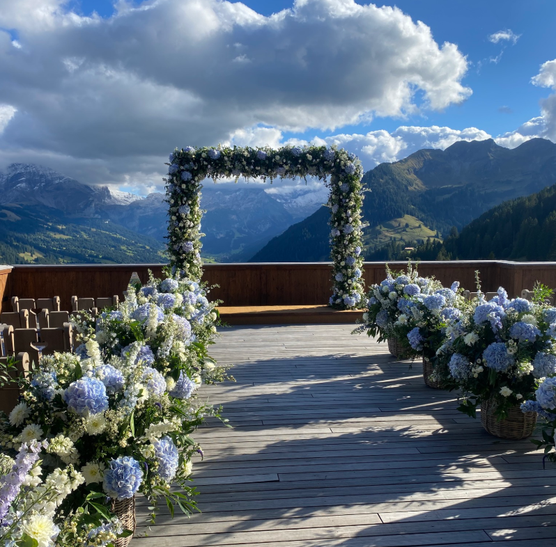 Set against the majestic backdrop of snow-capped peaks and rolling hills, this square floral arch creates a breathtaking focal point for an outdoor ceremony.