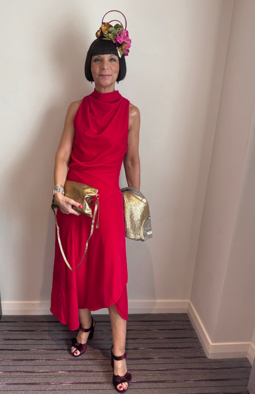 This stunning red dress paired with a gold clutch and floral headpiece creates a sophisticated winter wedding guest look.