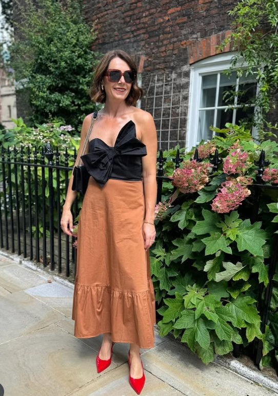 The structured black bow top pairs beautifully with a flowing caramel-brown skirt, while bold red heels add just the right amount of pop.