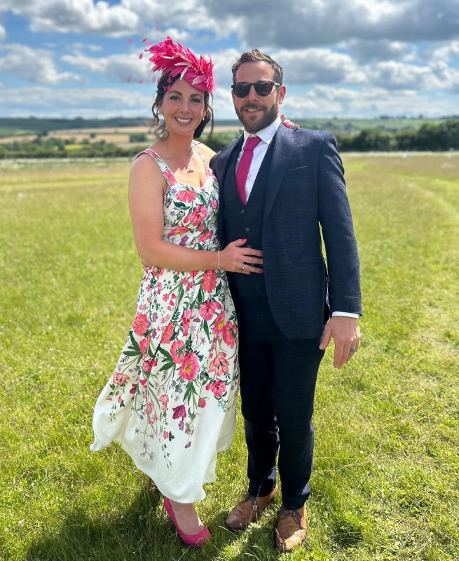 This look combines a vibrant floral dress with a striking pink fascinator and heels, creating a refreshing yet sophisticated outfit for winter wedding guests.