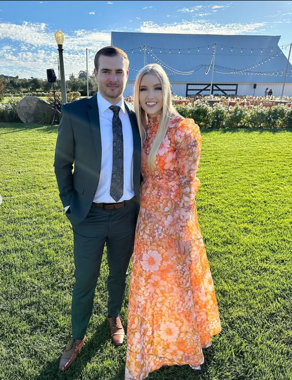Paired with a sharp suit and coordinating tie, this couple’s ensemble strikes the perfect balance between charm and chic seasonal flair.