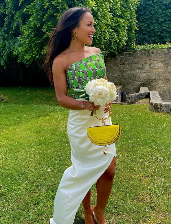 The bold yellow statement bag and delicate white florals add the perfect finishing touches, creating a look that’s both sophisticated and playful.