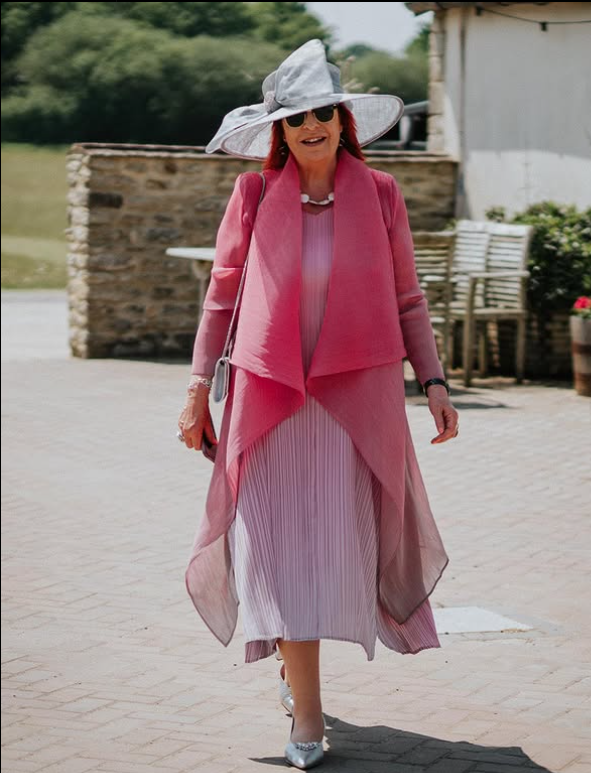 This stylish winter wedding guest outfit pairs a pleated lilac dress with a flowing pink overlay for a sophisticated layered look.