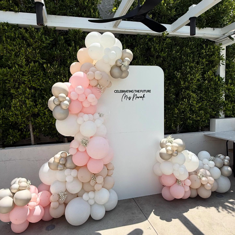 This romantic bridal shower setup features a dreamy balloon arch in blush pink, ivory, and metallic gold, creating the perfect backdrop for celebrating the bride-to-be.