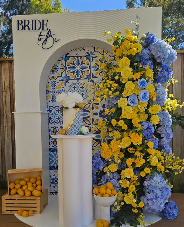 Featuring a bold backdrop of blue and yellow tile-inspired patterns, fresh lemons, and lush florals in bright yellow and soft blue, this setup is both lively and elegant.