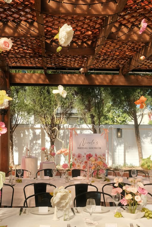 This dreamy bridal shower setup captures a romantic garden vibe with floating flowers, elegant table décor, and soft pastel details.