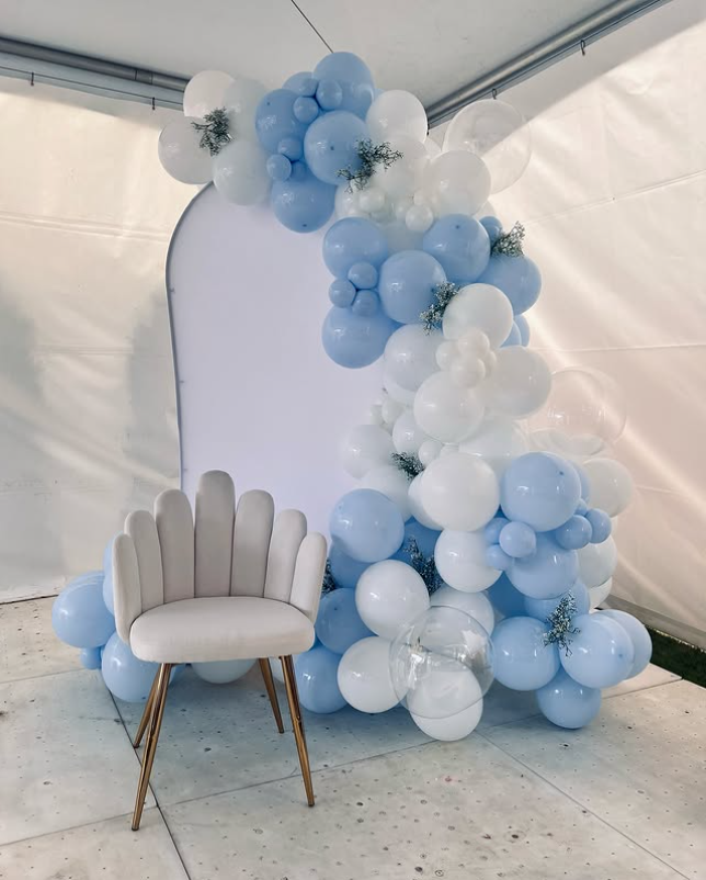 This chic balloon arch in soft blue and crisp white creates a dreamy backdrop for bridal shower photos.