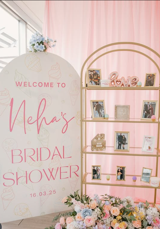 This sweet and stylish bridal shower setup features a personalized pink welcome sign paired with a gold shelving unit displaying cherished photos and love-themed décor.