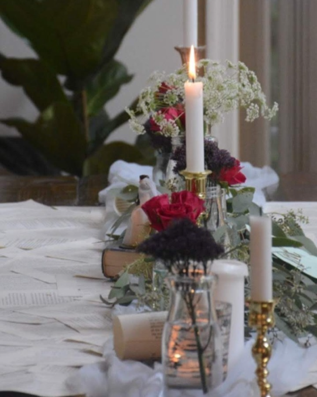 Pages from old books serve as the runner, accented with glowing candles, lush greenery, and bold red roses for a timeless touch.