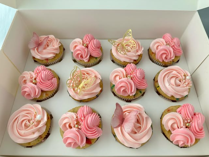 These stunning pink bridal shower cupcakes are decorated with delicate rosettes, edible pearls, and dainty butterfly toppers that add a whimsical and romantic flair.