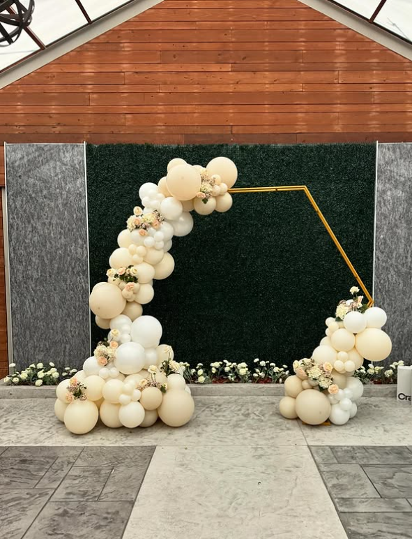 This stunning balloon arch in soft beige and ivory tones creates the perfect backdrop for a modern bridal shower.