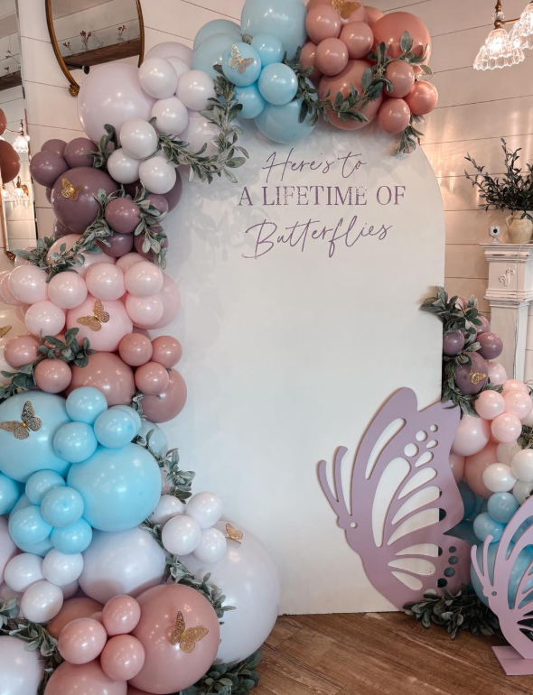 With pastel pink, blue, mauve, and white balloons accented by gold butterflies, it creates a magical setting full of charm and elegance.