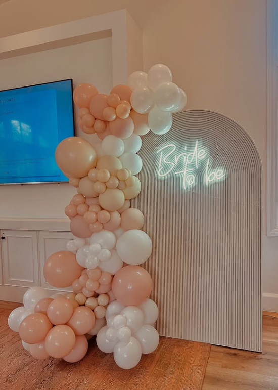 A chic and stylish bridal shower backdrop featuring soft nude, peach, and white balloons paired with a glowing neon “Bride to Be” sign.