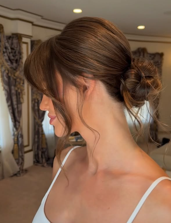 The softly curled face-framing strands add a romantic touch, while the undone bun keeps it modern and relaxed.