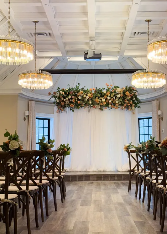 A lush floral arch of soft peach, cream, and greenery cascades above the altar, creating a romantic focal point.