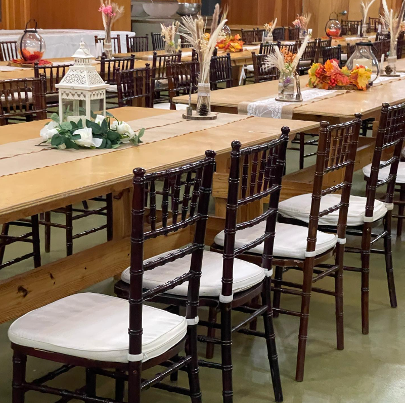 Wooden cross-back chairs adorned with small autumn-inspired arrangements complete the cozy yet elegant atmosphere, making it a perfect backdrop for a rustic fall wedding celebration.