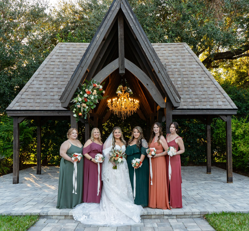 This bridal party embraces the season with rich autumn tones—deep greens, warm rusts, and burgundy gowns that perfectly complement a rustic outdoor chapel.