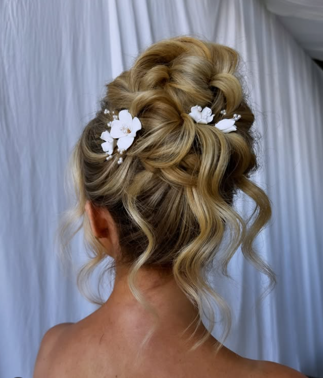 This romantic twisted bun is adorned with delicate white floral pins, making it a dreamy choice for brides.