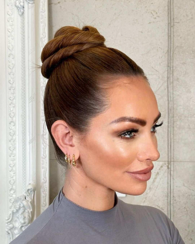 This sleek high bun with a twisted wrap detail exudes elegance and modern sophistication.