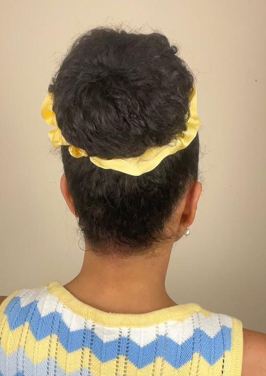 This voluminous curly high bun gets a playful yet elegant twist with a satin scrunchie detail.