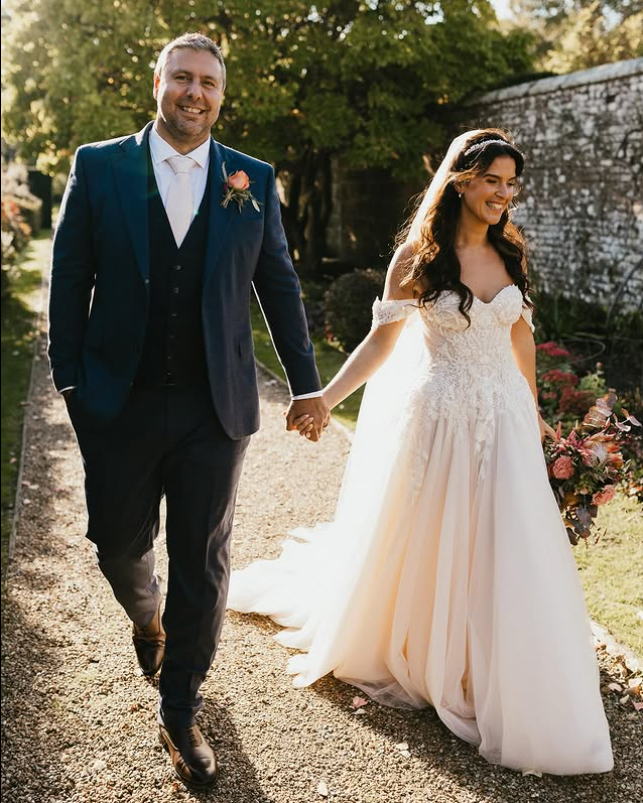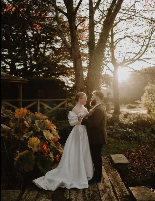 A radiant moment of the bride and groom strolling hand-in-hand through a sunlit garden, her flowing gown and his classic suit glowing in the warm autumn light—perfectly capturing the dreamy charm of an October wedding.