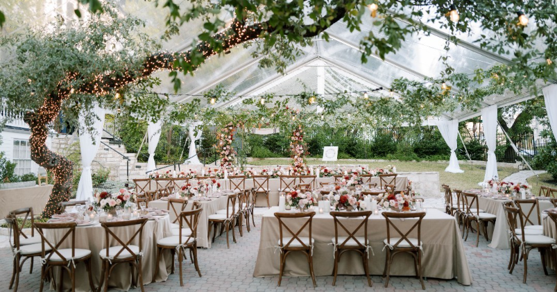 A breathtaking outdoor reception set beneath a clear tent with twinkle-lit trees, lush autumn blooms, and neutral-toned linens—creating an elegant and romantic October wedding celebration.