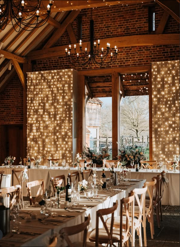 This cozy barn reception glows with cascading fairy lights, rustic wooden beams, and elegant autumn-inspired tablescapes—creating the perfect dreamy October wedding atmosphere.