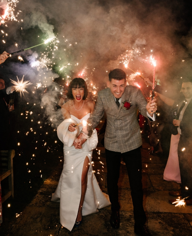 This energetic sparkler send-off captures the couple’s joy and excitement as they make their grand exit surrounded by glowing lights—an electrifying idea for a magical October wedding evening.