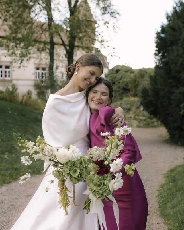 A tender moment as the bride embraces a loved one against a serene garden backdrop, holding a lush bouquet of autumn blooms—capturing the warmth and intimacy of an October wedding day.