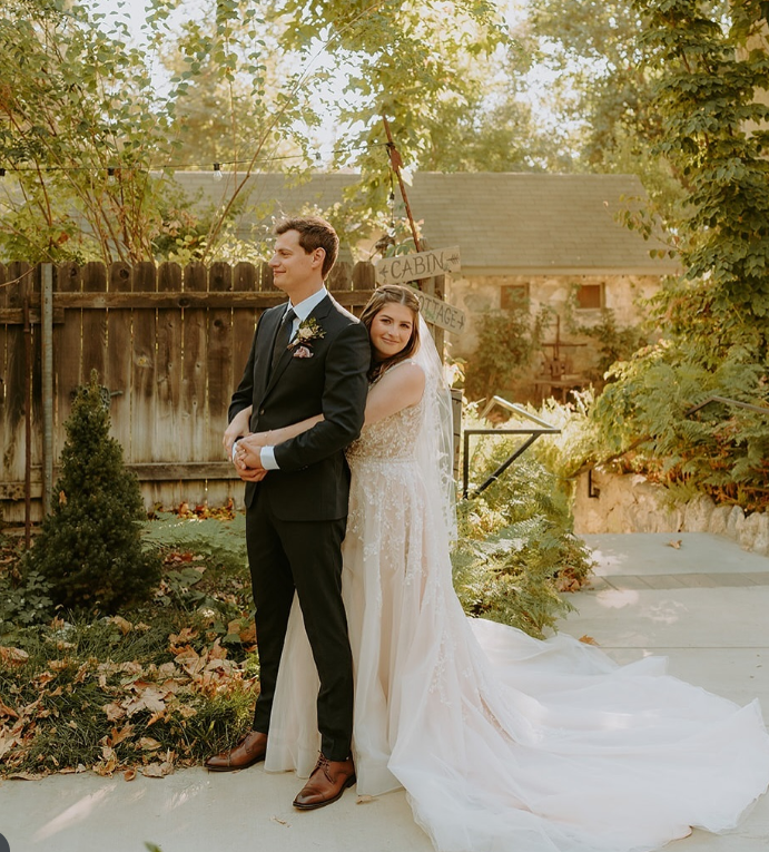 The bride’s sleek satin gown and the rustic wooden backdrop with autumn-inspired bunting create a cozy, festive atmosphere—perfect for an intimate October wedding celebration.