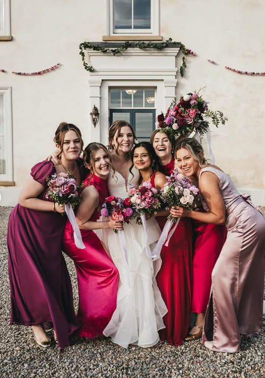 The bride beams with joy surrounded by her bridesmaids dressed in rich jewel-toned gowns—deep reds, berry pinks, and mauves—holding lush bouquets of fall florals.